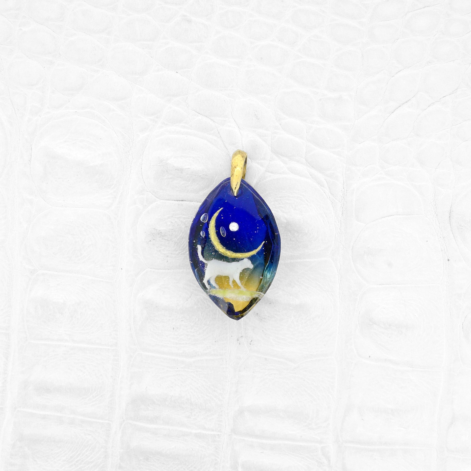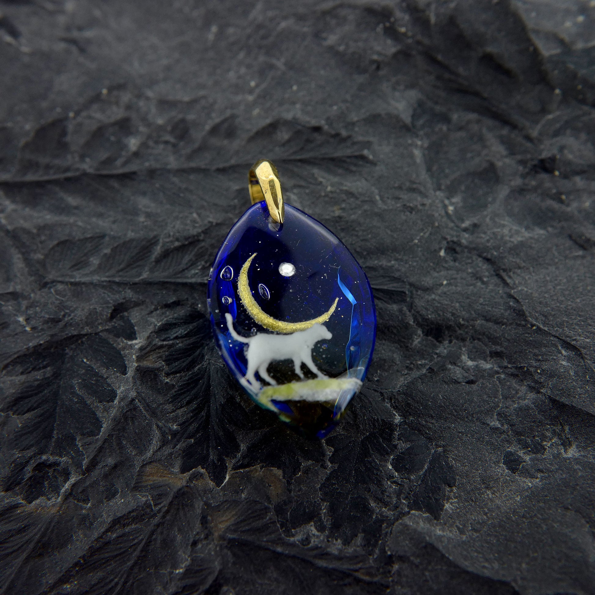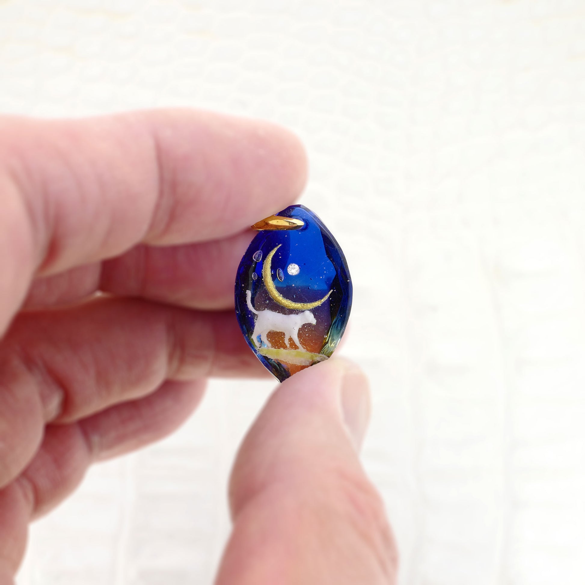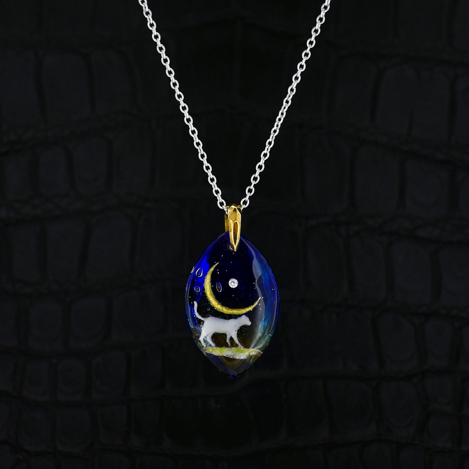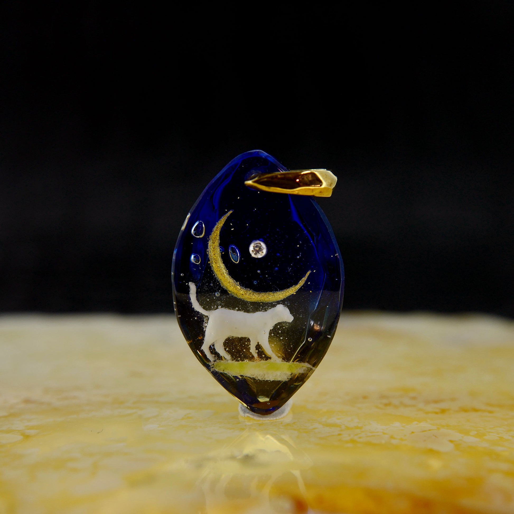 技術:ブラウンからディープブルーに移行する美しい夜空に浮かぶ三日月と、歩く白猫です。